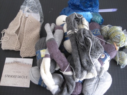 men hvis jeg nu siger, jeg lavede den der vest-ting til venstre, som i kvalitet ligner den sømandsdukke jeg strikkede i 4. klasse, sidste år i januar – og at den store bunke skulle blive til et dejligt patchwork-agtigt slumretæppe – jeg har 1½ bane af en meter, hvilket jo ikke engang ka fungere som fodvarmer til en dværg – og at garnet til højre skulle blive til dejlige ja-det-har-jeg-glemt og så viste det sig også at være ret så afskyeligt da jeg først gik igang…..