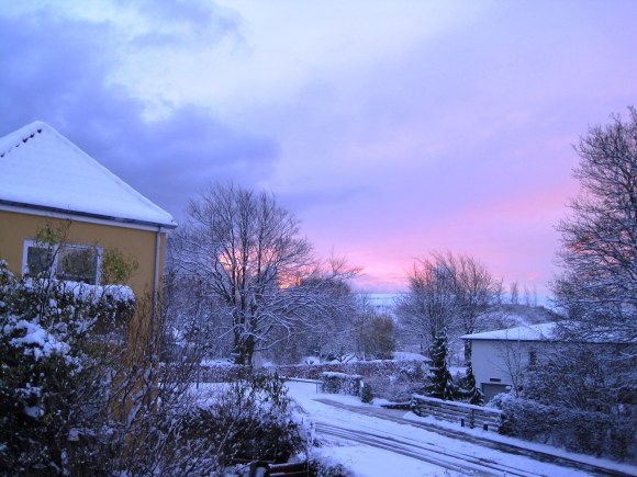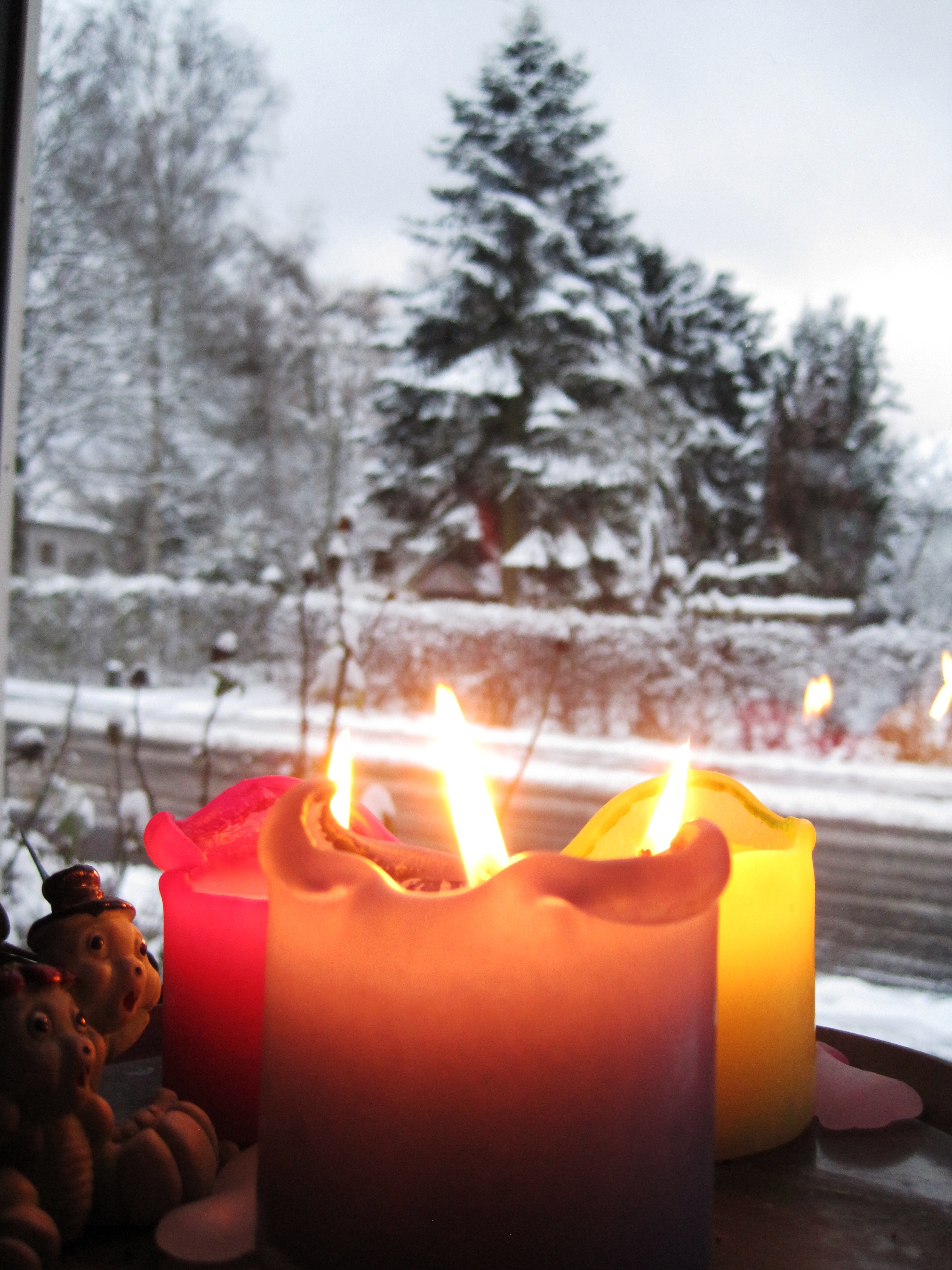 I stedet har jeg hængt vasketøj op, spist en hel pomelo og det meste af en pose bolsjer, drukket en kop kaffe og næsten tømt en kande te, tændt stearinlys, nærlæst en opskrift til en appelsinkage jeg skal bage til i morgen, og så har jeg taget billeder af sneen for det er sgu da fint at det kommer lige nu, hvor vi skal lege december og jul og alting. Total god timing – og i øvrigt sådan en vinter, der får mine børn til at vokse op fuldt overbeviste om, at hver eneste af deres barndoms vintre bød på meter høje snedriver. Og det uanset om sneen er væk igen på mandag…