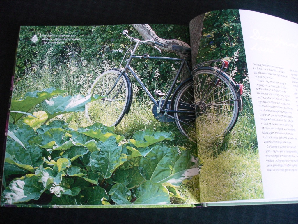 Men så fandt jeg billedet fra vores have i bogen – og hvad skal man nu mene om, at det, hun har valgt at fremhæve fra vores lille frimærke, ikke er alle de bede, jeg gravede ud med tyk mave og plukveer, men det der tiny-lille-bitte hjørne, vi aldrig blev færdige med, og hvor der stod en gammel cykel, som skulle have været på lossepladsen for længe siden?