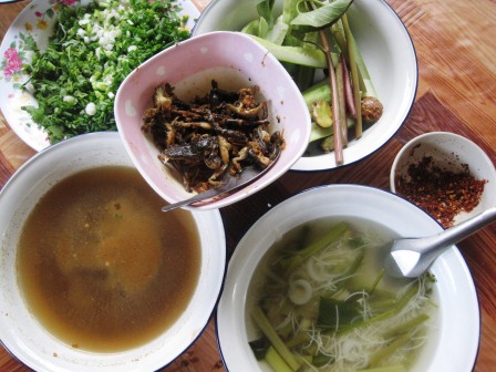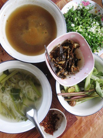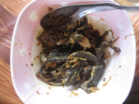Lækkert og spicy. Og dog den lille skål øverst var alligevel lidt for eksotisk for mig. Hvis du kan gætte, hvad det er giver jeg en souvenir fra Thailand. Og jeg vil da godt gå så langt at sige, at det ikke er firben, for det fik vi igår. Og det er heller ikke en grøntsag, selvom de er fanget i nat på marken lige ved siden af. Tæt på ser de sådan ud: